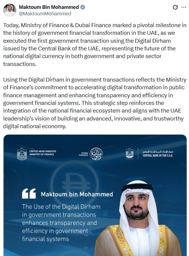 Wasaaradda Maaliyadda ee Imaaraadka iyo ta Dubai ayaa Talaadadii sheegtay in macaamilkaasi uu qeyb ka ahaa marxaladda tijaabada ee mashruuca Dirhamka Dhijitaalka ah, iyadoo la adeegsanayo madal lacag-bixin oo dowladeed oo lagu magacaabo mBridge.