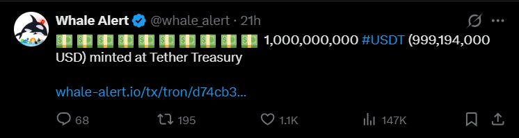 Tether ayaa shalay daabacday 1B oo USDT ah xigasho : Whale Alert