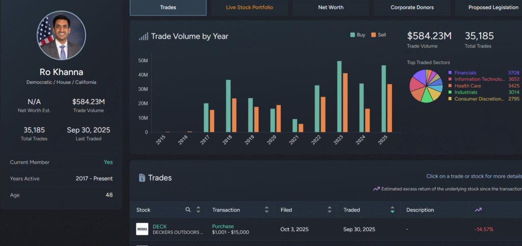 Xogta laga helay Quiver Quant ayaa muujineysa in Khanna uu sameeyay $80.3 milyan oo doolar oo ganacsi saamiyo ah sanadkan 2025, halka guud ahaan uu tan iyo 2017 sameeyay in ka badan 35,000 ganacsi oo ku fadhiya $580 milyan, kuwaas oo inta badan diiradda saaraya maaliyadda, tiknoolojiyada, iyo caafimaadka.
