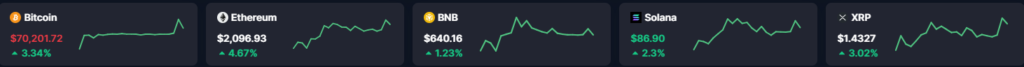 • Bitcoin (BTC) waa Coin-ka ugu qiimaha badan lacagaha Digital-ka ah e Crypto wuxuu joogaa qiimihiisa manta $70,201.21