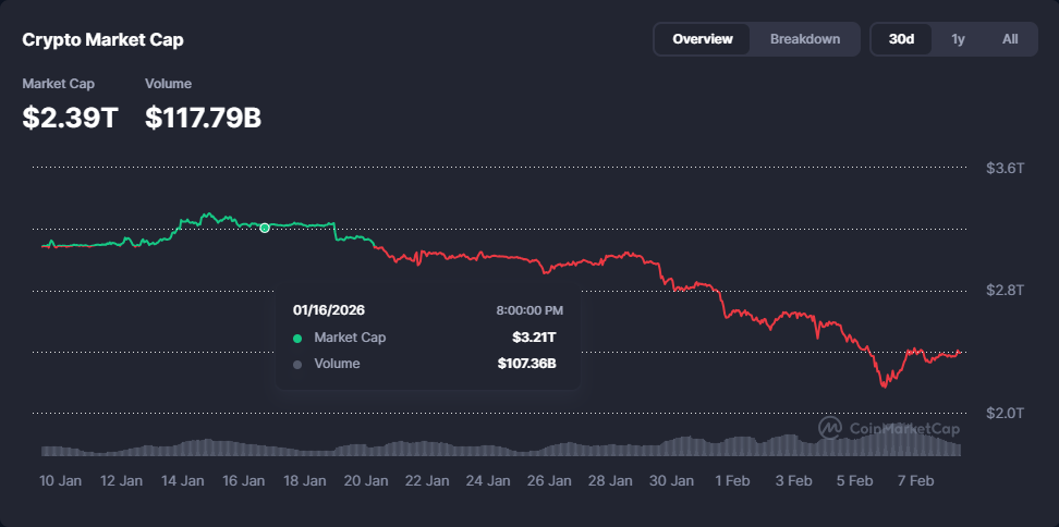 • Market Cap ka guud ee suuqa waxuu joogaa maanta $2.39 trillion, halka (Volume) hantida guud ee suuqa la isku dhaafsaday 24 saac u dambaysay ay gaarayso 117.79 billion.