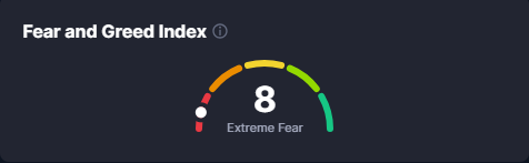 • Fear and Greed index halbeega lagu cabiro dareenka maalgashiyaasha waxuu muujinayaainuu yahay 8% taasoo ka dhigan inay hoosayso damaca maalgashiyaasha suuqa.