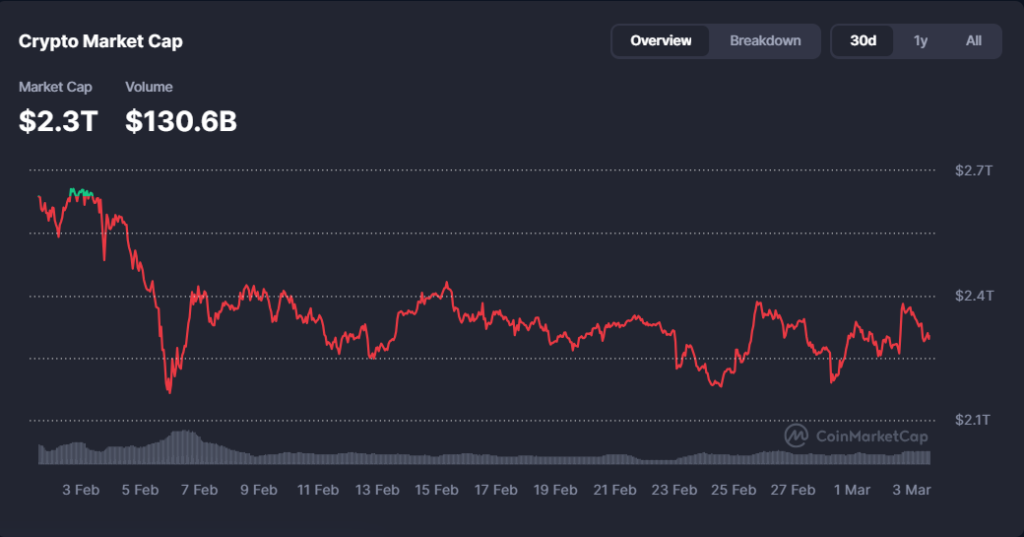 - Market Cap ka guud ee suuqa waxuu joogaa maanta $2.3 trillion, halka (Volume) hantida guud ee suuqa la isku dhaafsaday 24 saac u dambaysay ay gaarayso 130.81 billion.