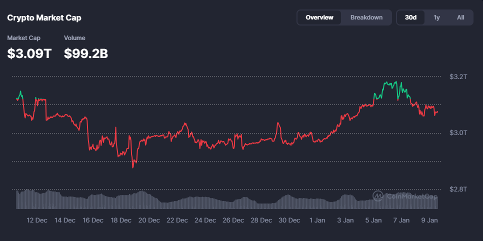 - Market Cap ka guud ee suuqa waxuu joogaa maanta $3.09 trillion, halka (Volume) hantida guud ee suuqa la isku dhaafsaday 24 saac u dambaysay ay gaarayso 99.2 billion.