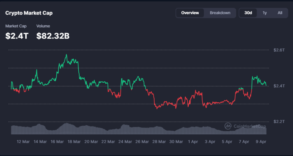 - Market Cap ka guud ee suuqa waxuu joogaa maanta $2.4 trillion, halka (Volume) hantida guud ee suuqa la isku dhaafsaday 24 saac u dambaysay ay gaarayso 82.32 billion.