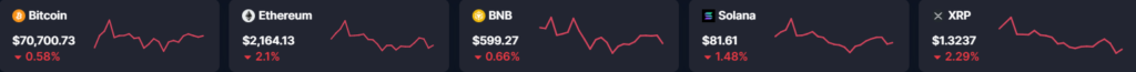 - Bitcoin (BTC) waa Coin-ka ugu qiimaha badan lacagaha Digital-ka ah e Crypto wuxuu joogaa qiimihiisa manta $70,585.21