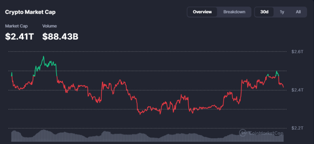- Market Cap ka guud ee suuqa waxuu joogaa maanta $2.41 trillion, halka (Volume) hantida guud ee suuqa la isku dhaafsaday 24 saac u dambaysay ay gaarayso 88.43 billion.