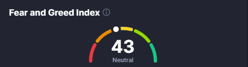- Fear and Greed index halbeega lagu cabiro dareenka maalgashiyaasha waxuu muujinayaainuu yahay 43% taasoo ka dhigan inay hoosayso damaca maalgashiyaasha suuqa.