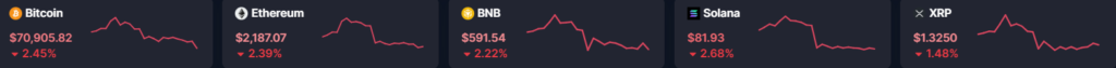 - Bitcoin (BTC) waa Coin-ka ugu qiimaha badan lacagaha Digital-ka ah e Crypto wuxuu joogaa qiimihiisa manta $70,905.21