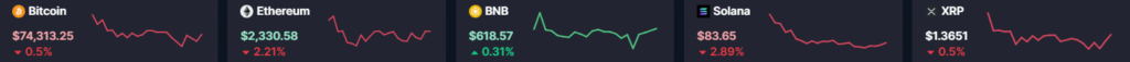 - Bitcoin (BTC) waa Coin-ka ugu qiimaha badan lacagaha Digital-ka ah e Crypto wuxuu joogaa qiimihiisa manta $74,585.21