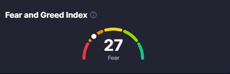 - Fear and Greed index halbeega lagu cabiro dareenka maalgashiyaasha waxuu muujinayaainuu yahay 27% taasoo ka dhigan inay hoosayso damaca maalgashiyaasha suuqa.