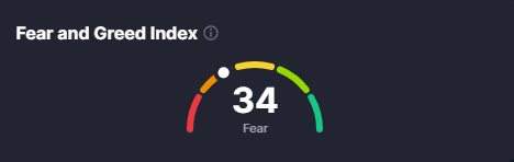 - Fear and Greed index halbeega lagu cabiro dareenka maalgashiyaasha waxuu muujinayaainuu yahay 34% taasoo ka dhigan inay hoosayso damaca maalgashiyaasha suuqa.