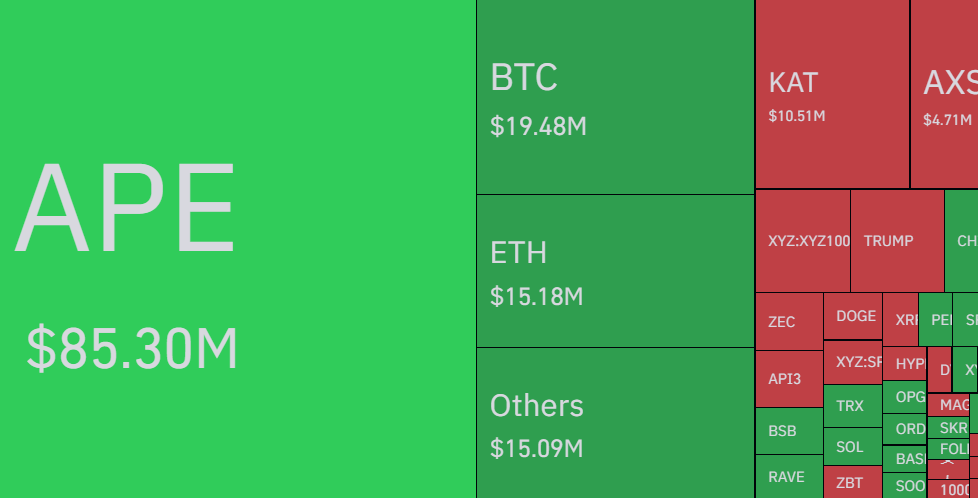 In ka badan $187.02M ayaa lagu qasaaray suuqa 24-kii saac ee la soo dhaafay, iyadoo $104.99M ay ka yimaadeen dad kor u galay suuqa (Long positions).