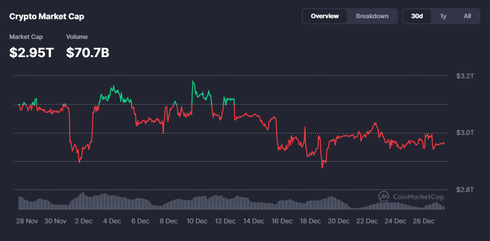 - Market Cap ka guud ee suuqa waxuu joogaa maanta $2.95 trillion, halka (Volume) hantida guud ee suuqa la isku dhaafsaday 24 saac u dambaysay ay gaarayso 70.7 billion.