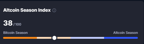 - Altcoin season Index waxuu sheegayaa in uu yahey 38% taasoo ka dhigan in damaca altcoins laga qabo ay soo hagaagayso