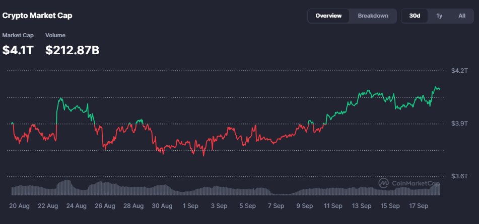 • Market Cap ka guud ee suuqa waxuu joogaa maanta $4.1 trillion, halka (Volume) hantida guud ee suuqa la isku dhaafsaday 24 saac u dambaysay ay gaarayso 212.87 Billion.