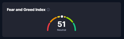 • Fear and Greed index halbeega lagu cabiro dareenka maalgashiyaasha waxuu muujinayaainuu yahay 51% taasoo ka dhigan meel dhexe.