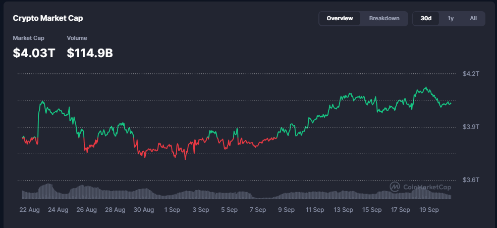 • Market Cap ka guud ee suuqa waxuu joogaa maanta $4.03 trillion, halka (Volume) hantida guud ee suuqa la isku dhaafsaday 24 saac u dambaysay ay gaarayso 114.9 Billion.