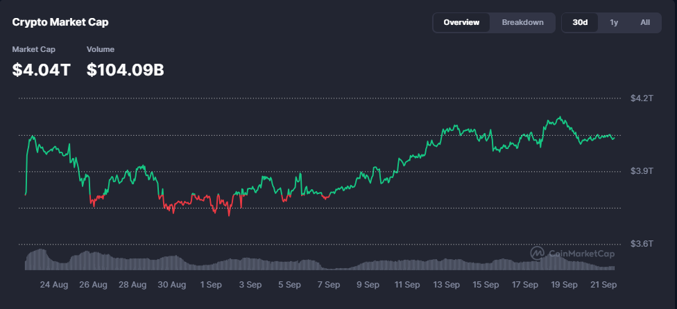 - Market Cap ka guud ee suuqa waxuu joogaa maanta $4.04 trillion, halka (Volume) hantida guud ee suuqa la isku dhaafsaday 24 saac u dambaysay ay gaarayso 104.09 Billion.