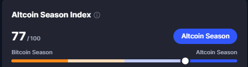 - Altcoin season Index waxuu sheegayaa in uu yahey 77% taasoo ka dhigan in damaca altcoins laga qabo ay aad u sarayso.