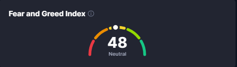 - Fear and Greed index halbeega lagu cabiro dareenka maalgashiyaasha waxuu muujinayaainuu yahay 48% taasoo ka dhigan inay hoosayso damaca maalgashiyaasha suuqa.