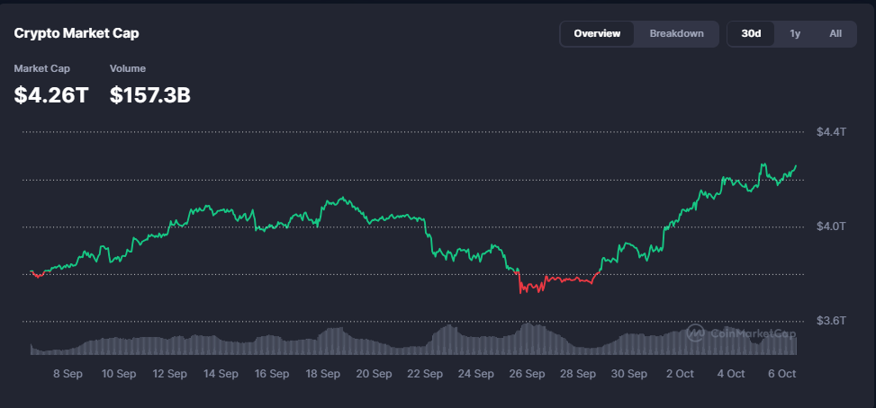 - Market Cap ka guud ee suuqa waxuu joogaa maanta $4.26 trillion, halka (Volume) hantida guud ee suuqa la isku dhaafsaday 24 saac u dambaysay ay gaarayso 157.3 Billion.
