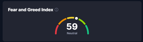 - Fear and Greed index halbeega lagu cabiro dareenka maalgashiyaasha waxuu muujinayaainuu yahay 59% taasoo ka dhigan inay hoosayso damaca maalgashiyaasha suuqa.