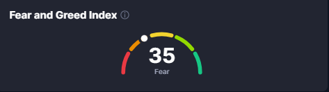 • Fear and Greed index halbeega lagu cabiro dareenka maalgashiyaasha waxuu muujinayaainuu yahay 35% taasoo ka dhigan inay hoosayso damaca maalgashiyaasha suuqa.