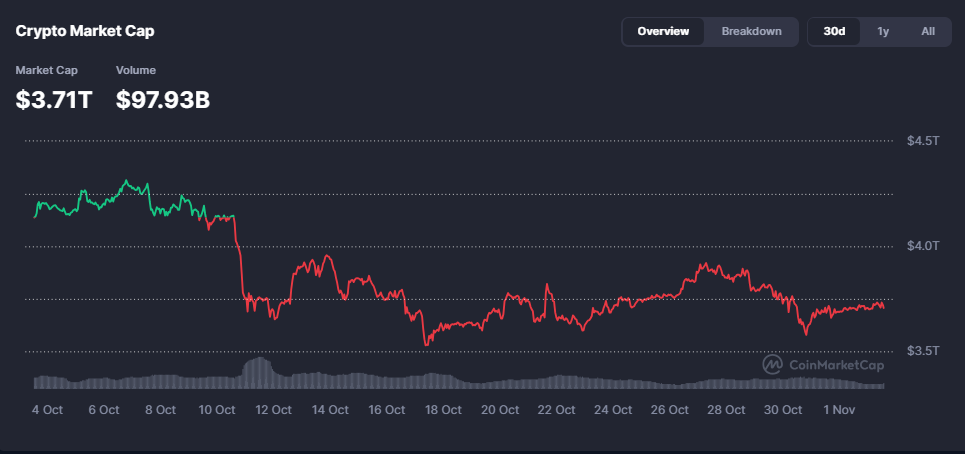 • Market Cap ka guud ee suuqa waxuu joogaa maanta $3.71 trillion, halka (Volume) hantida guud ee suuqa la isku dhaafsaday 24 saac u dambaysay ay gaarayso 97.81 billion.