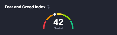- Fear and Greed index halbeega lagu cabiro dareenka maalgashiyaasha waxuu muujinayaainuu yahay 42% taasoo ka dhigan inay hoosayso damaca maalgashiyaasha suuqa.
