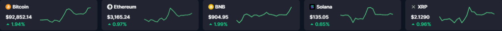 - Bitcoin (BTC) waa Coin-ka ugu qiimaha badan lacagaha Digital-ka ah e Crypto wuxuu joogaa qiimihiisa manta $92,852.21