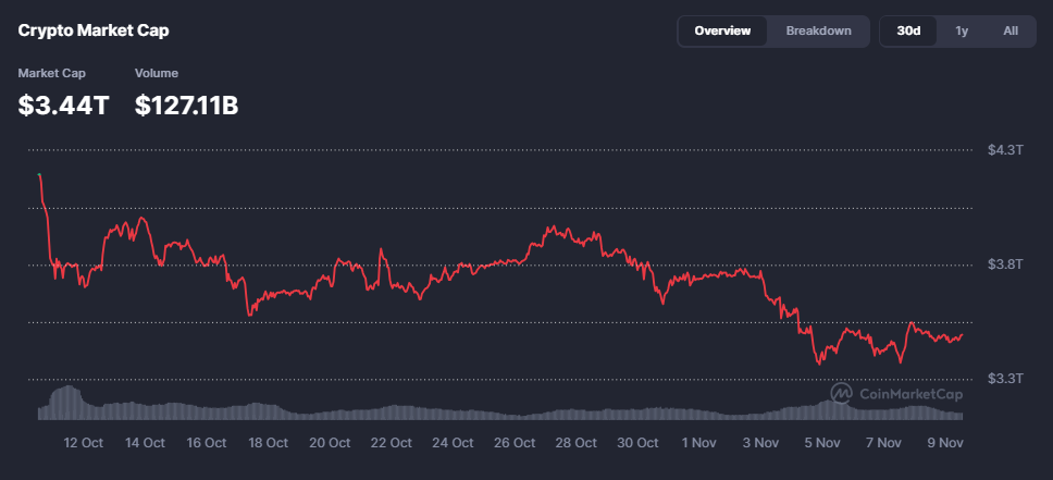 - Market Cap ka guud ee suuqa waxuu joogaa maanta $3.44 trillion, halka (Volume) hantida guud ee suuqa la isku dhaafsaday 24 saac u dambaysay ay gaarayso 127.11 billion.