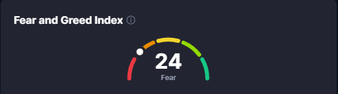 - Fear and Greed index halbeega lagu cabiro dareenka maalgashiyaasha waxuu muujinayaainuu yahay 24% taasoo ka dhigan inay hoosayso damaca maalgashiyaasha suuqa.