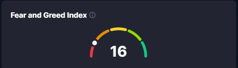 - Fear and Greed index halbeega lagu cabiro dareenka maalgashiyaasha waxuu muujinayaainuu yahay 16% taasoo ka dhigan inay hoosayso damaca maalgashiyaasha suuqa.