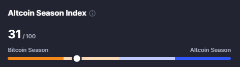 - Altcoin season Index waxuu sheegayaa in uu yahey 31% taasoo ka dhigan in damaca altcoins laga qabo ay soo hagaagayso