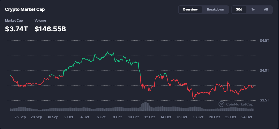 - Market Cap ka guud ee suuqa waxuu joogaa maanta $3.74 trillion, halka (Volume) hantida guud ee suuqa la isku dhaafsaday 24 saac u dambaysay ay gaarayso 146.55 Billion.