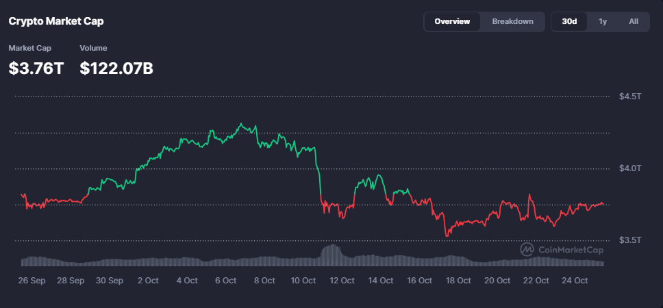 • Market Cap ka guud ee suuqa waxuu joogaa maanta $3.80 trillion, halka (Volume) hantida guud ee suuqa la isku dhaafsaday 24 saac u dambaysay ay gaarayso 160.81 Billion.