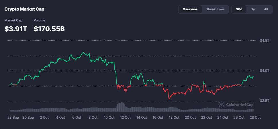 - Market Cap ka guud ee suuqa waxuu joogaa maanta $3.91 trillion, halka (Volume) hantida guud ee suuqa la isku dhaafsaday 24 saac u dambaysay ay gaarayso 170.81 billion.