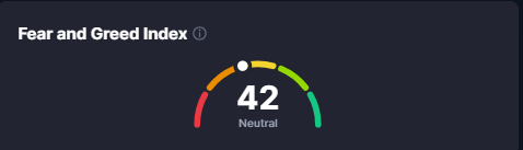 - Fear and Greed index halbeega lagu cabiro dareenka maalgashiyaasha waxuu muujinayaainuu yahay 42% taasoo ka dhigan inay hoosayso damaca maalgashiyaasha suuqa.
